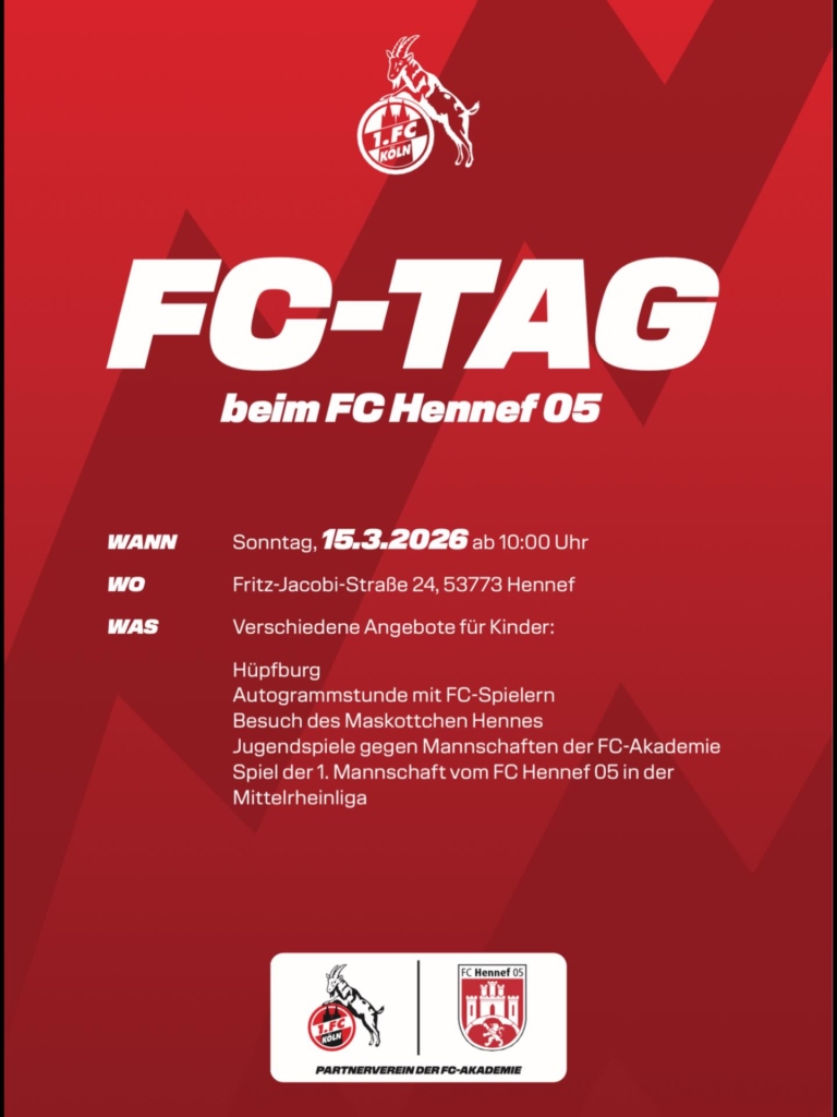 Clubnews 05 3. Spieltag in der U17 DFB-Nachwuchsliga Mittwoch, Februar 25, 2026 Super Einstieg in die MRL-Rückrunde Mittwoch, Februar 25, 2026 FC-Tag mit unserem Partnerverein 1. FC Köln! Donnerstag, Februar 19, 2026 Fussballclub Hennef 05Besonders und gutErlebe unser Team hautnah im Anton Klein Sportpark beim Kampf um die Meisterschaft. Gespannt, mitfiebernd, emotionsgeladen. Stadionatmosphäre besonders und gut. Ticketshop ErgebnisseDie letzten SpieleBald verfügbar NeuigkeitenClubnews 05 CampsFC Hennef 05 Termine Ostern 2026 Anmelden