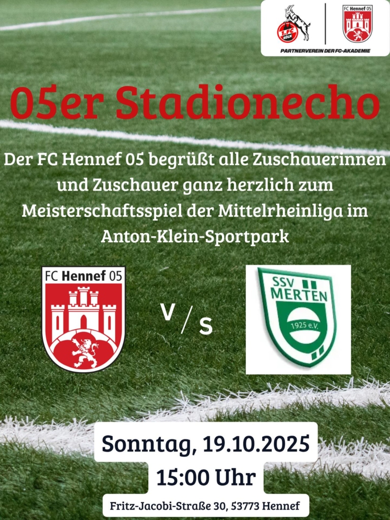 Clubnews 05 FVM-Pokalderby gegen Regionalligist Bonner SC ist fest terminiert Samstag, Oktober 18, 2025 Ohne Punkte vom Kellerduell zurückgekehrt Dienstag, Oktober 14, 2025 Starke Bilanz unserer Jugendteams! Samstag, Oktober 11, 2025 Fussballclub Hennef 05Besonders und gutErlebe unser Team hautnah im Anton Klein Sportpark beim Kampf um die Meisterschaft. Gespannt, mitfiebernd, emotionsgeladen. Stadionatmosphäre besonders und gut. Ticketshop ErgebnisseDie letzten SpieleBald verfügbar NeuigkeitenClubnews 05 CampsFC Hennef 05 Termine Herbst 2025 Anmelden