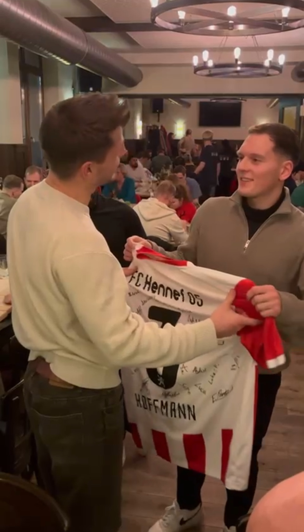 Es war aber auch für einen Spieler ein Abend des Abschieds. Sommerneuzugang Tim Hoffmann verlässt uns zum Jahresende. Beruflich zieht es den sympathischen und sehr geschätzten Spieler aus Rheinland-Pfalz ins Nachbarland Hessen. Er wird ab Jahresanfang Physiotherapeut bei der Damen-Bundesligamannschaft von Eintracht Frankfurt. Als Abschiedsgeschenk erhielt er sein FCH05-Trikot, unterschrieben von allen seinen Mitspielern, dem Sportchef, den Trainern und dem Staff, von Kapitän Ansgar Pflüger unter dem Applaus aller Anwesenden überreicht. Es wird sicherlich einen Ehrenplatz in seiner Wohnung erhalten.