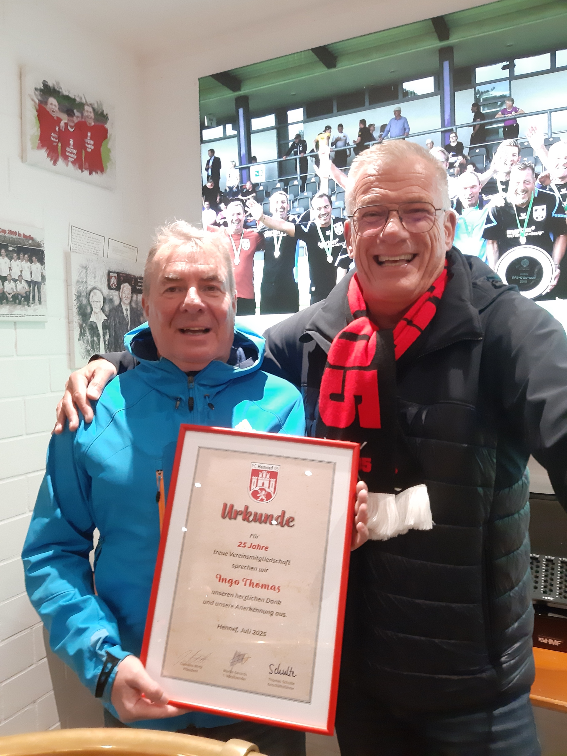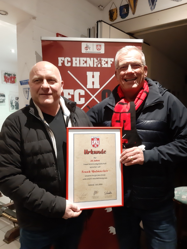 (henmo) Nachträglich wurden Ingo Thomas und Frank „Huti“ Hutmacher für je 25 Jahre Vereinstreue ausgezeichnet. Präsident Clemens Wirtz überreichte den beiden noch aktiven „AH“-Spielern im Vereinsclubheim die Ehrenurkunden.